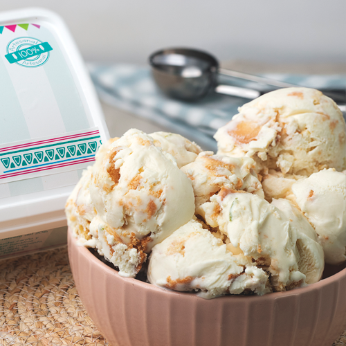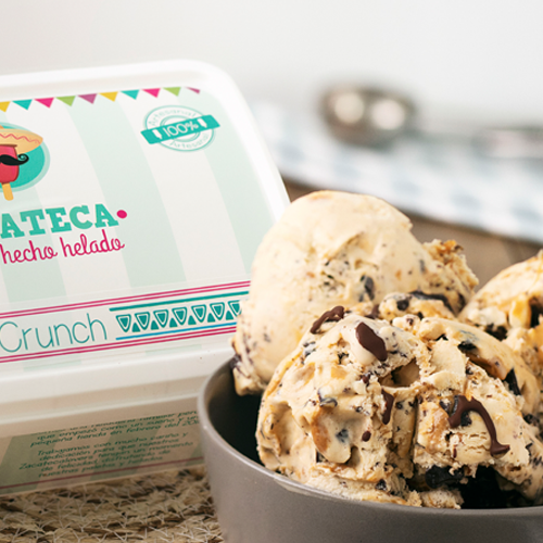 Helado de maní estilo italiano con topping de manjar blanco y straciatella de chocolate.