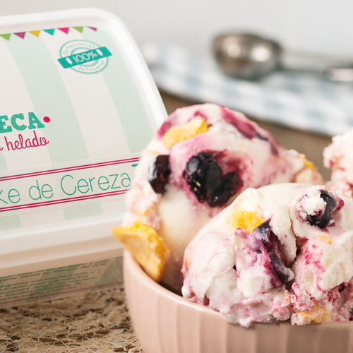 Helado de cheesecake estilo italiano con toppings de masa y mermelada de cereza.