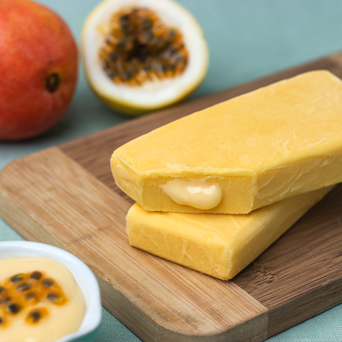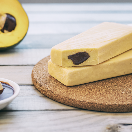 Helado tipo paleta de crema de mango, relleno con una crema de maracuyá.
