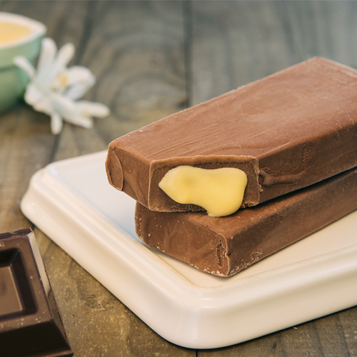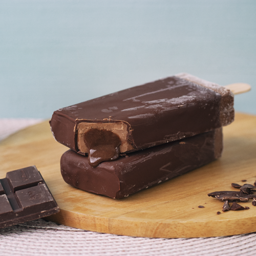Helado tipo paleta de chocolate, rellena con fudge de chocolate.