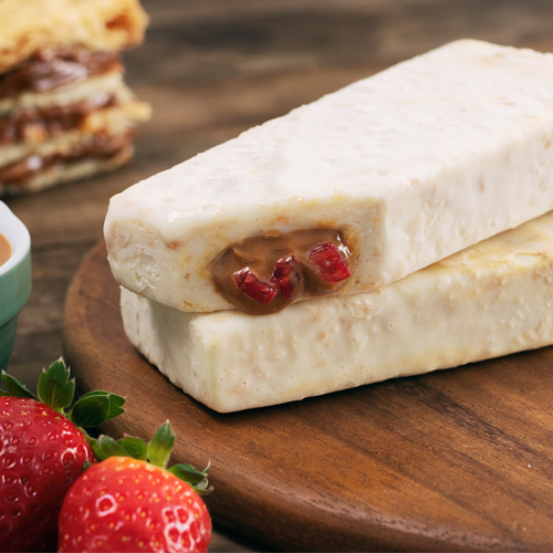 Helado tipo paleta de crema con pedazos de masa hojaldre, relleno de manjar blanco con pedazos de fresa.