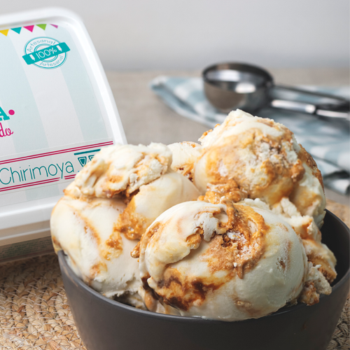 Helado de chirimoya estilo italiano con topping de merengue y manjar blanco.