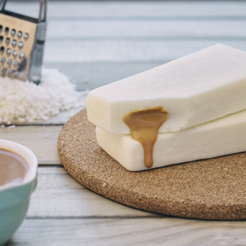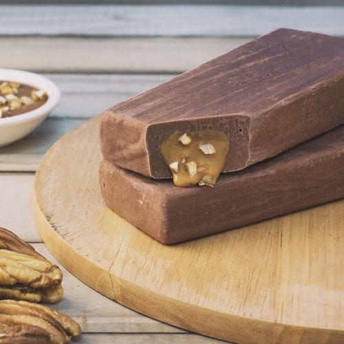 Helado tipo paleta de chocolate, rellena de manjar blanco con pedazos de pecanas.