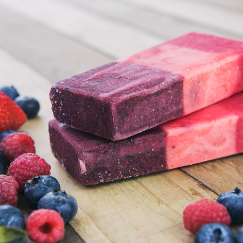 Helado tipo paleta de pura fruta, sabor arándano, fresa y frambuesa.