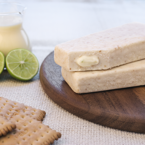 Helado tipo paleta de crema con pedazos de masa de pie, rellena con crema de limón.