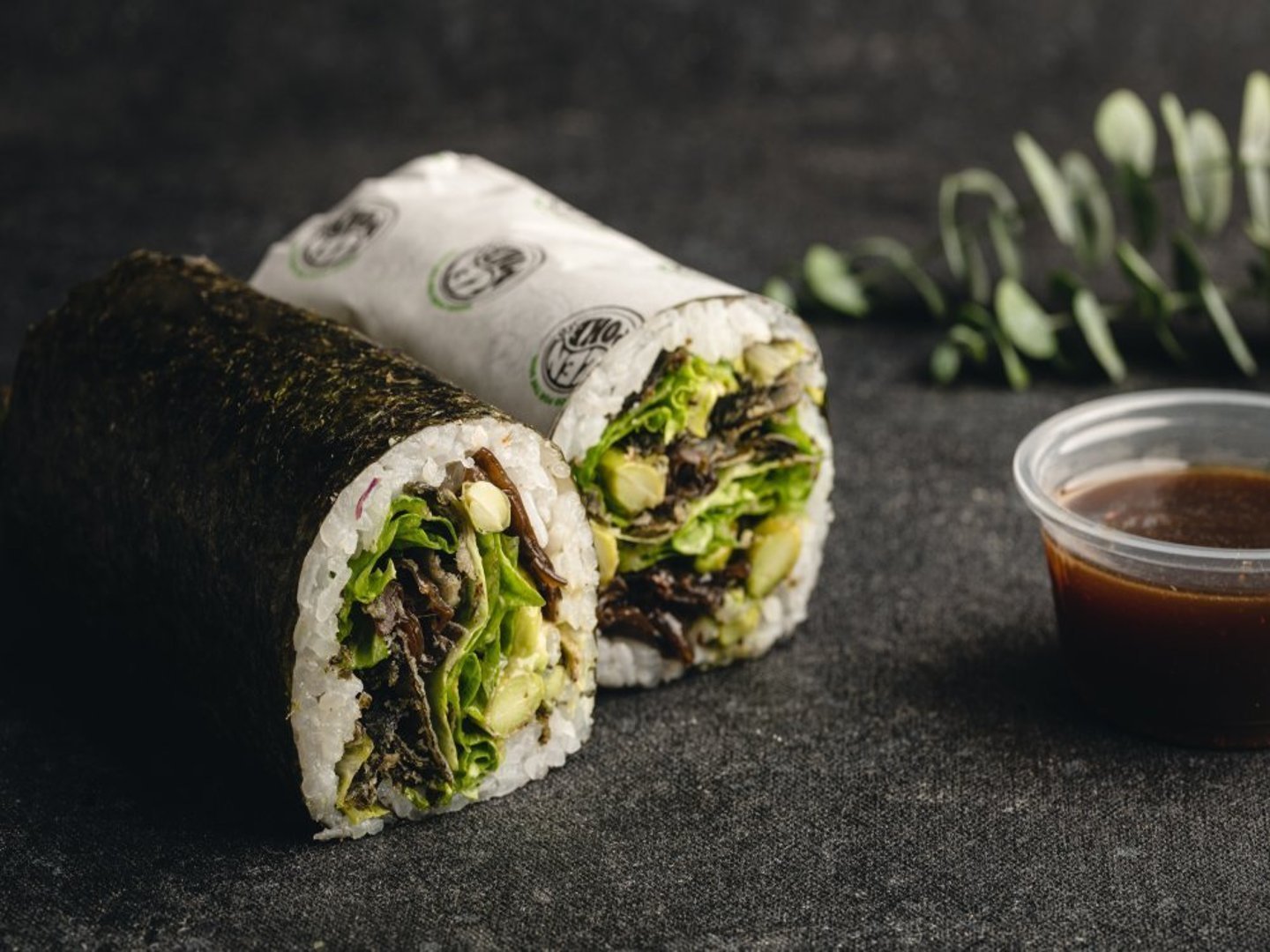 Burrito de shari con hongos al wok, edamame, palta, mix de lechugas, nori crocante y culantro. Acompañado con salsa ponzu y shoyu.