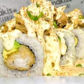Maki empanizado y frito relleno de palta más pollo con salsa de plátano picante, 1 gaseosa y 2 salsas a elección. Incluye Pepsi 355 ml