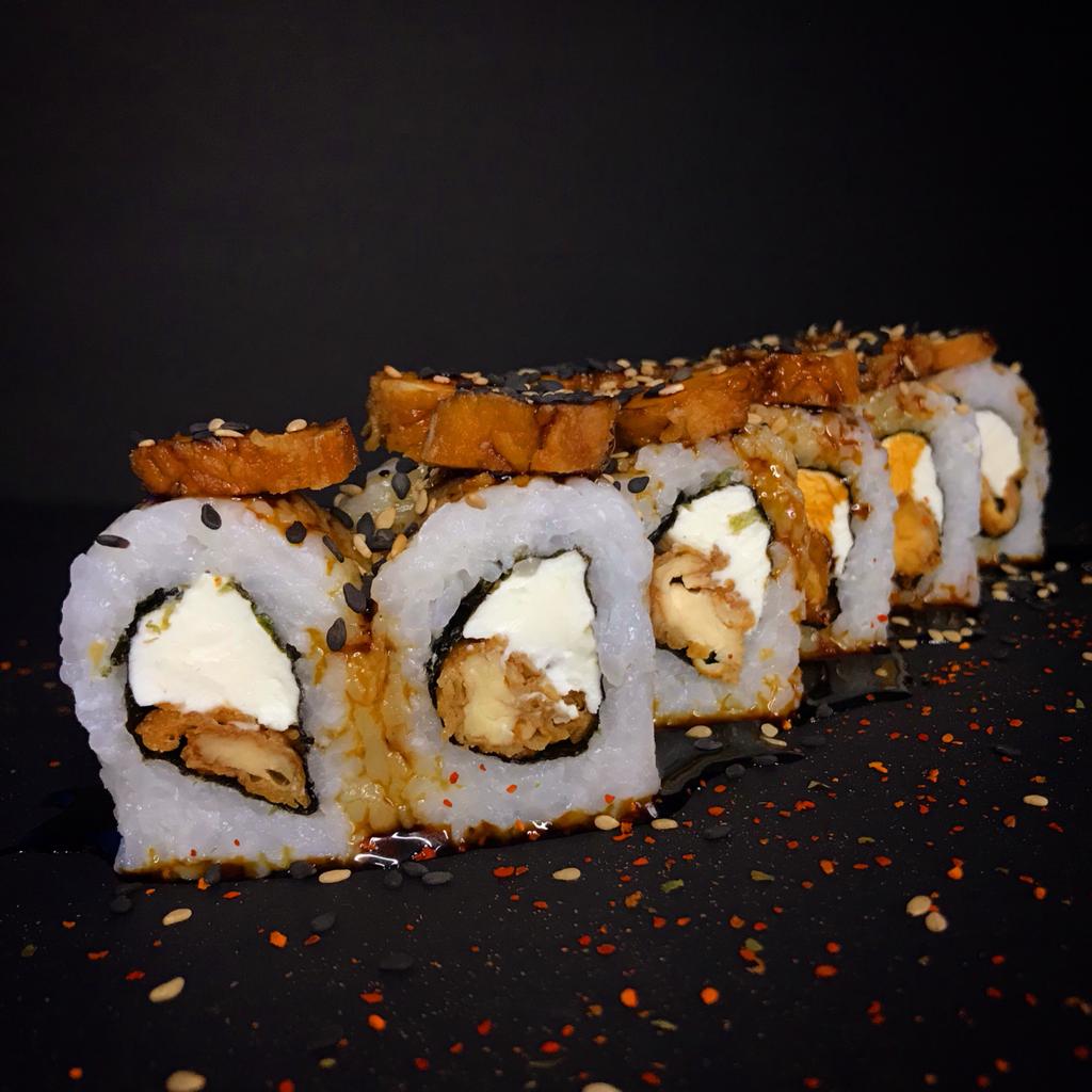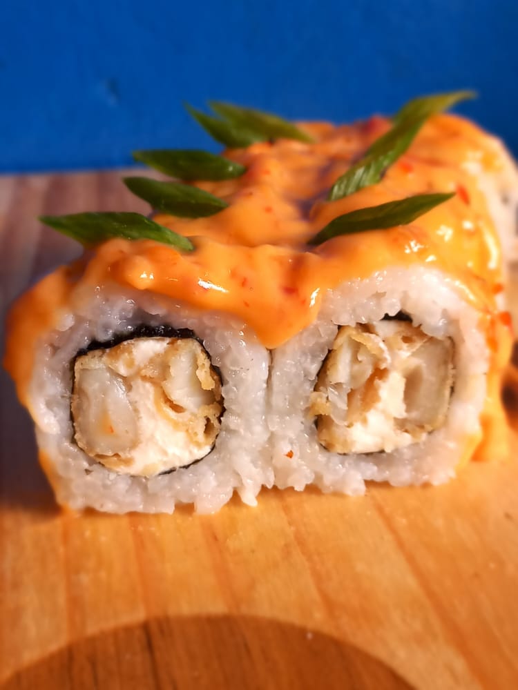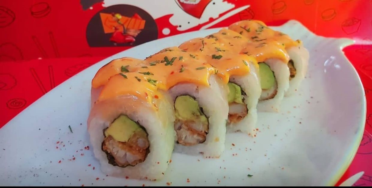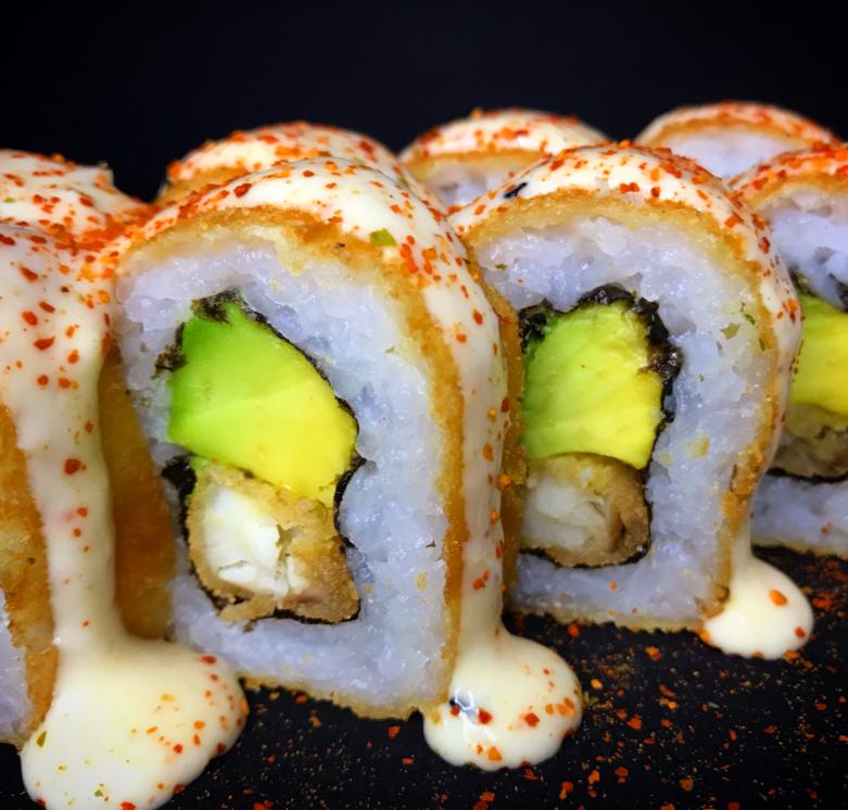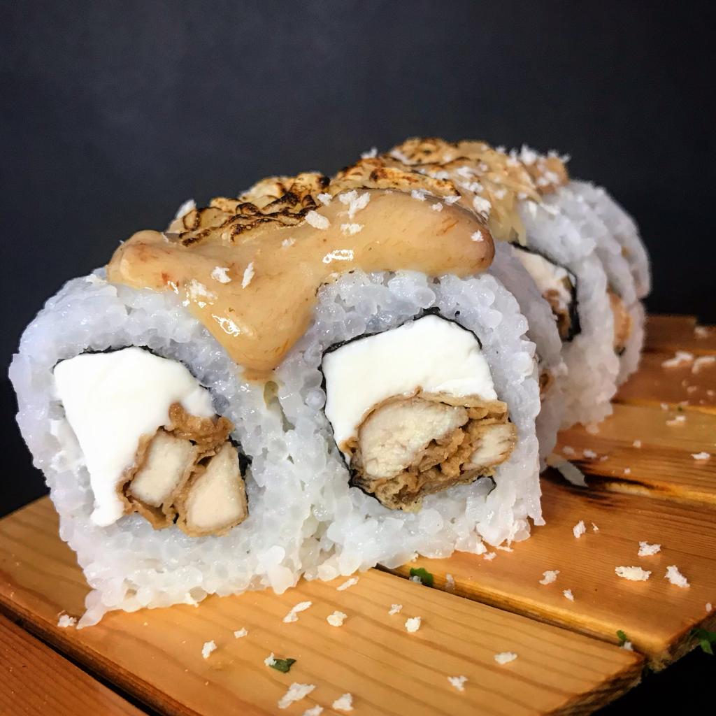Relleno de pescado y palta, cubierto de pescado, salsa maguro flameado y cebolla china.