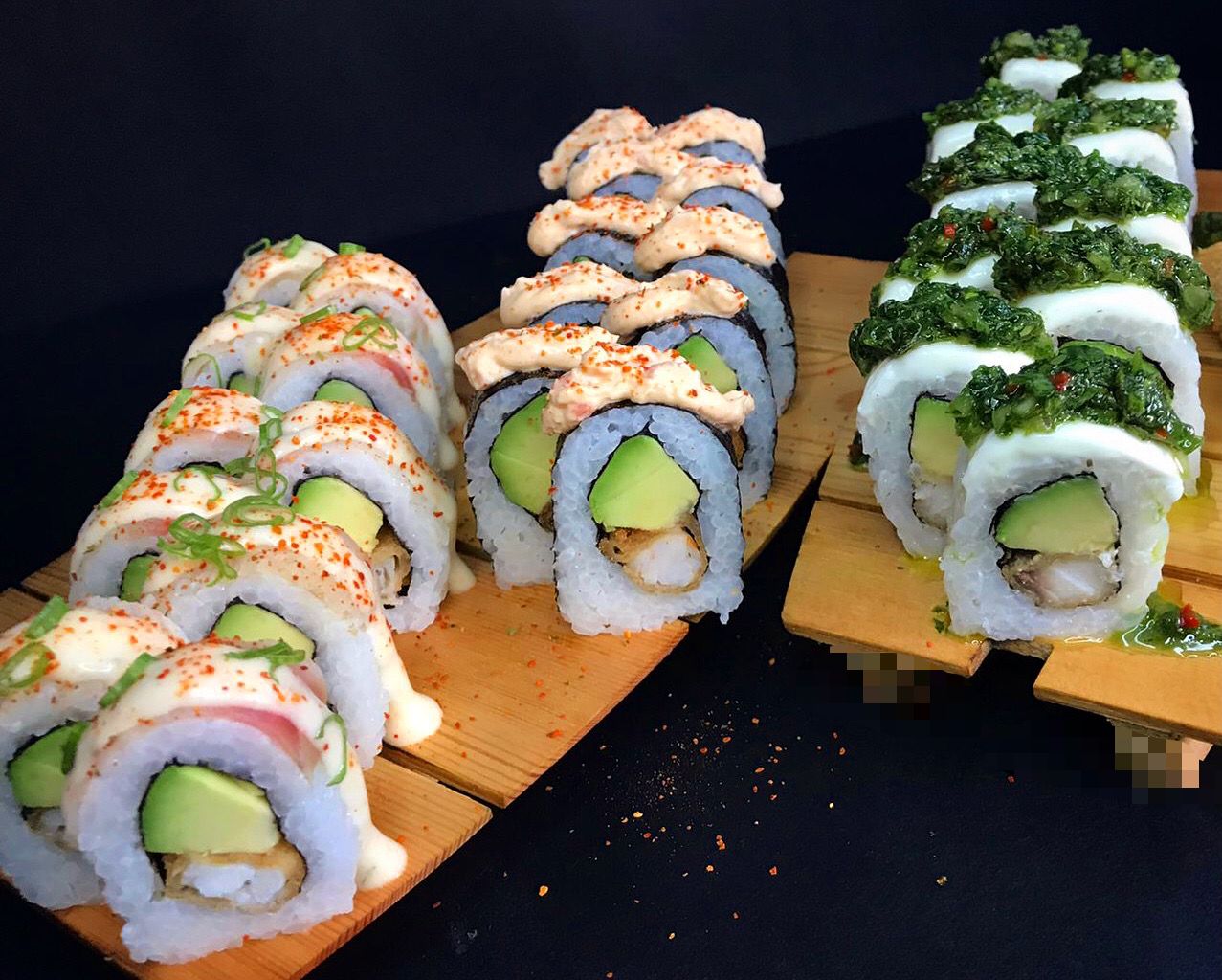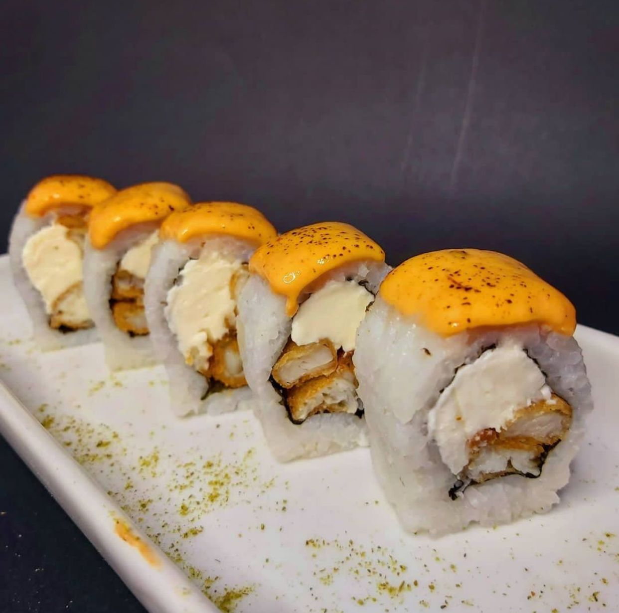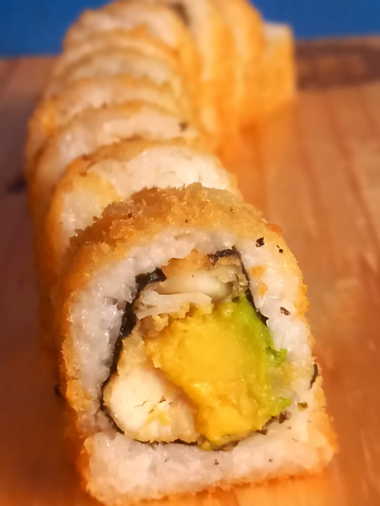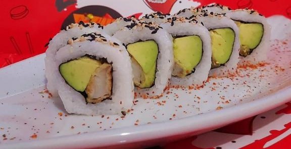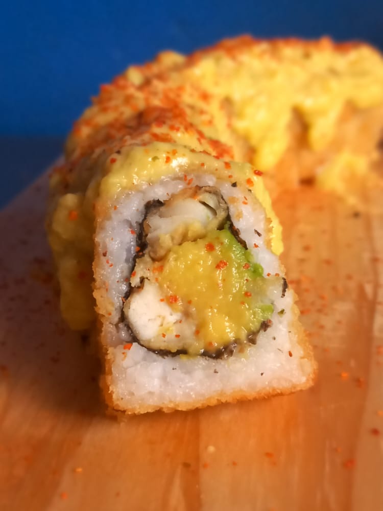 Relleno de pescado y palta, cubierto de pescado, salsa maguro flameado y cebolla china.
